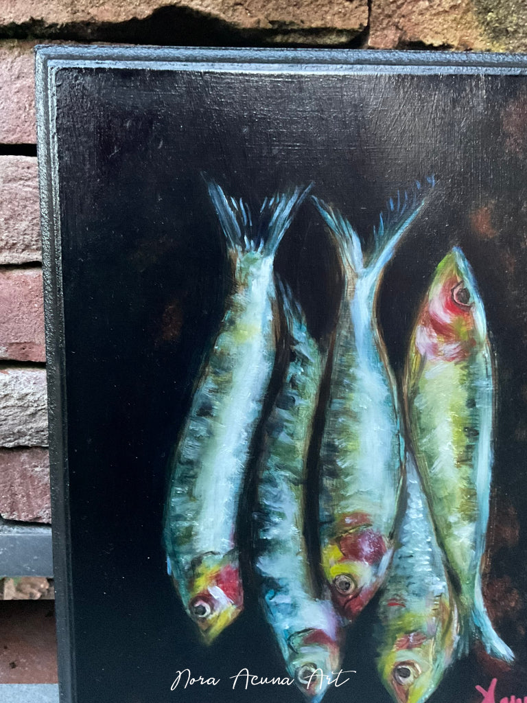 A small trompe-l'oeil captivating still life of sardines, shimmering in silvery hues against a dark background. Rustic.