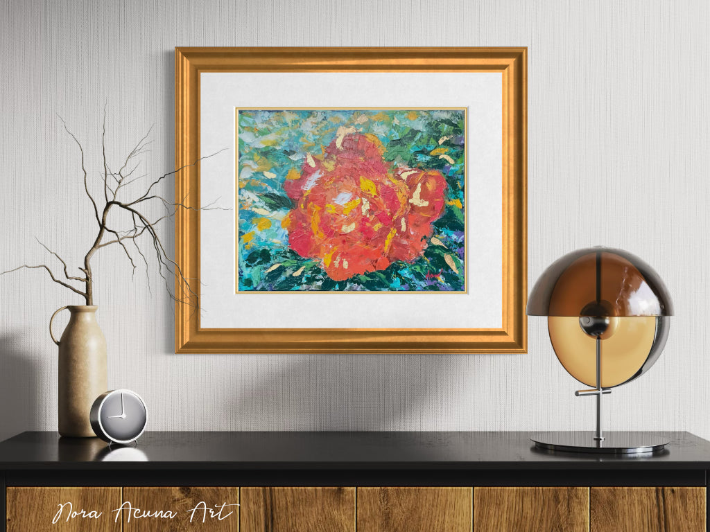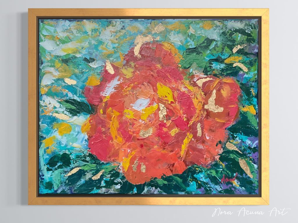 Vibrant and energetic abstract rose with bold brushstrokes and marks. A mix of sea and earthly colors. Added accents in "gold" foil to embellish the textured layers and lively hues.